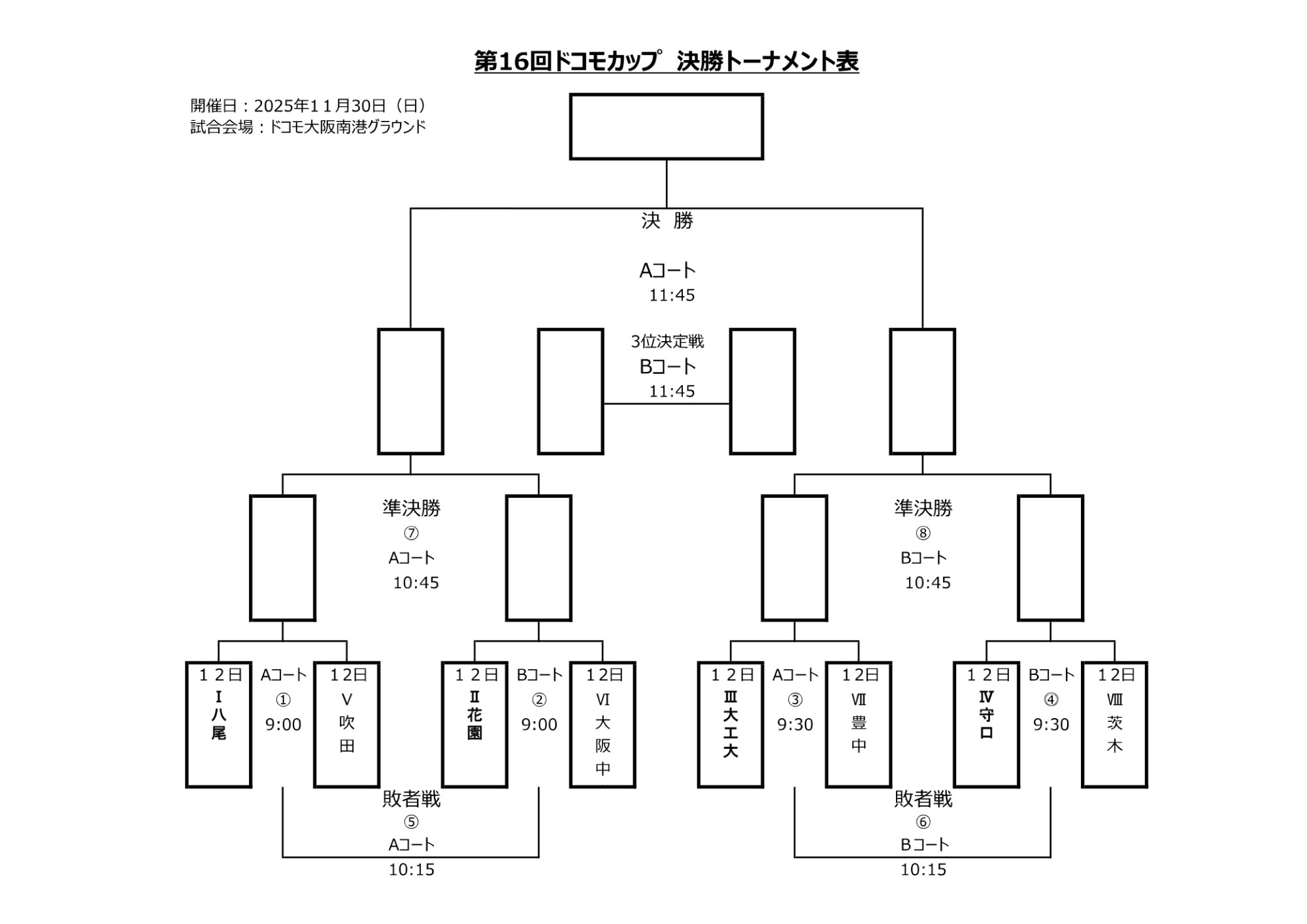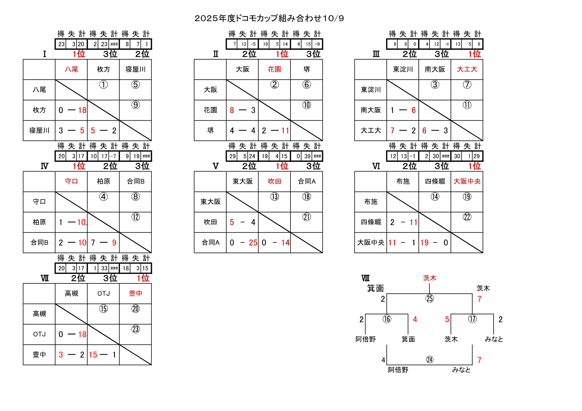 おおきに商店presents第16回ドコモカップ予選結果について 2025年11月11日 ツイート 小学6年生を対象とした大阪府NO1を決めるミニラグビー大会「おおきに商店presents第16回ドコモカップ」予選会が、ドコモ大阪南港グラウンドにて開催されました。 今回の大会には合同チームを含めて全25チームが参加し決勝トーナメント進出に向けて熱い戦いが繰り広げられました。 ■予選結果 ■決勝トーナメント 尚、決勝トーナメントは、2025年11月30日(日)にドコモ大阪南港グラウンドにて開催いたします。