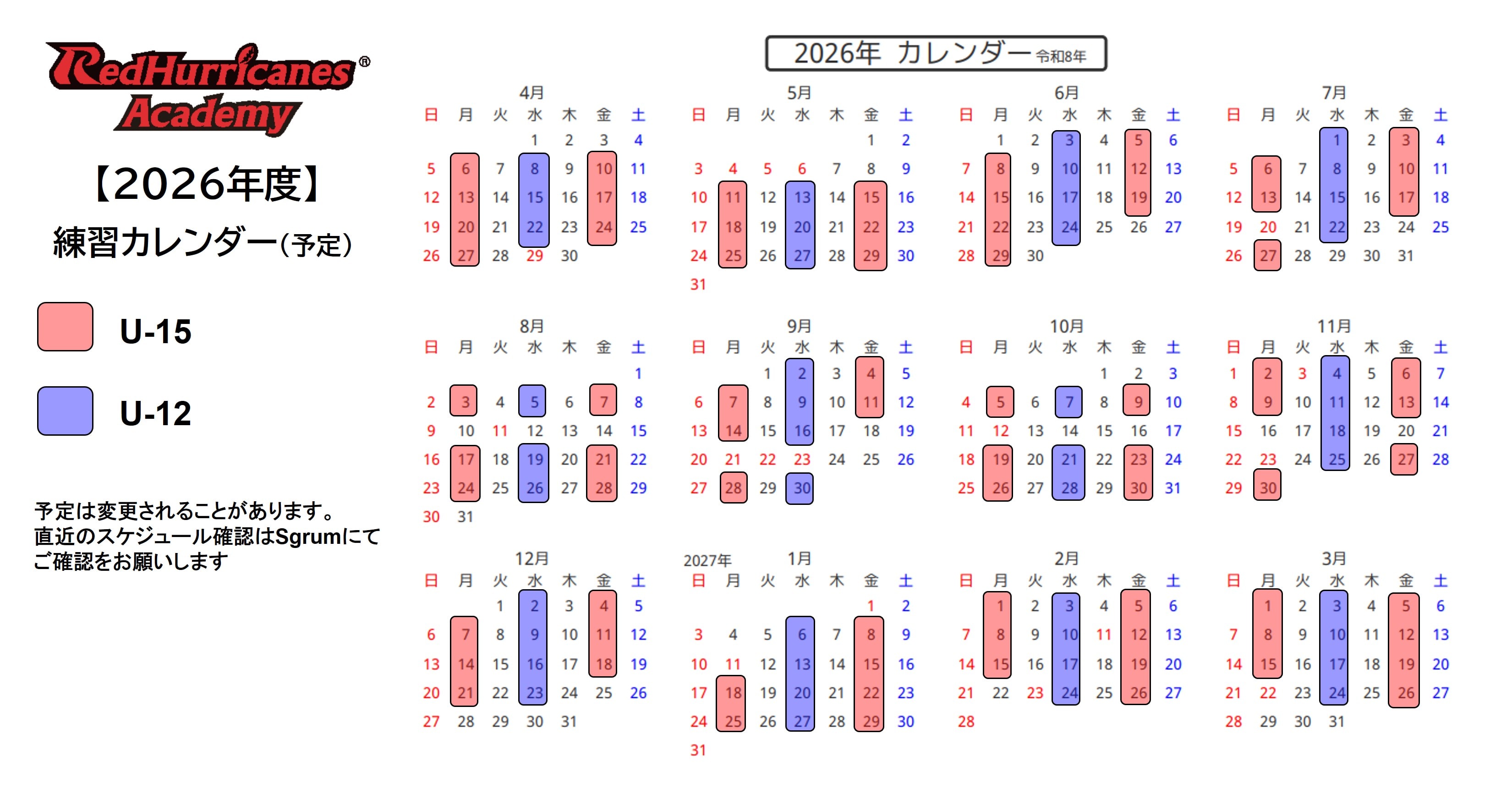 ※U12体験会についてはエントリークラスにお越しください。