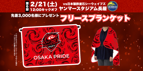 2026年2月21日(土) NTT JAPAN RUGBY LEAGUE ONE 2025-26 DIVISION2 第6節 レッドハリケーンズ大阪 vs 日本製鉄釜石シーウェイブス にて、来場いただいた方のうち先着3,000名様に、フリースブランケットをプレゼントいたします。